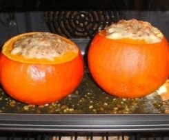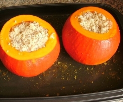 Kürbisse in eine Auflaufform stellen, Gemüsebrühe hinzu angießen - Kürbisse im vorgeheizten Backofen 40 -45 Min./ 160°C/ Umluft backen