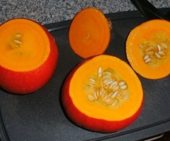 - Kürbis halbieren, und mit einem Kräuter-Dip servieren