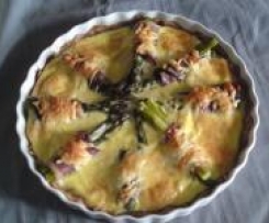 Je eine Scheibe Schinken um zwei/drei Spargelhälften wickeln und schön auf den Käse legen.