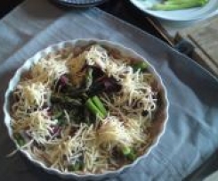 grüner Spargel halbieren und in das Garkörbchen legen --- 10 min. Varoma Stufe 1 kochen und anschliessend etwas abkühlen lassen.Die Hälfte des geriebenen Käses auf den nackten Teigboden verteilen.