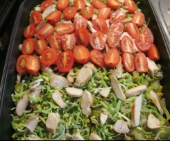 - Weitere Zutaten einschichten, zuletzt Tomaten halbieren, mit der Schnittfläche nach oben legen, mit Salz und Pfeffer würzen