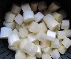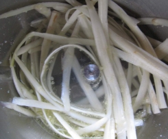 Den weißen Spargel schälen, die Enden abschneiden und die Schalen aufheben. Die Spargelstangen in ca. 1 cm große Stücke schneiden und in den Garkorb geben. Die Spitzen beiseite legen.