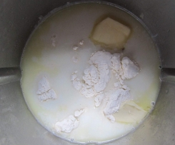 "Mixtopf geschlossen" wiegen. Mit Milch auf 800 g auffüllen. Mehl und Butter hinzufügen und kurz auf St. 4 verrühren.