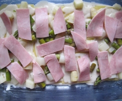 1/3 des Spargels und des Kochschinkens darauf legen.