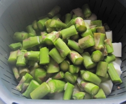 Inzwischen den grünen Spargel ebenfalls in ca. 1 cm große Stücke schneiden. Die Enden abschneiden und die Spitzen beiseite legen. Die Spargelstücke zu dem weißen Spargel in den Garkorb geben und weitere 4 Min. / Varoma / St. 1 garen.