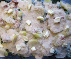 - Mit Kartoffeln und Soße abschließen. Die Masse mit dem Paniermehl bestreuen und Butterflöckchen darüber verteilen.