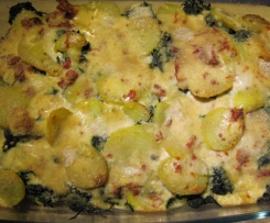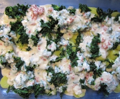 - Die Kartoffeln und den Spinat abwechselnd in die Auflaufform schichten, dabei jede Schicht mit etwas Soße übergießen. Ich habe 3x Kartoffen und 2x Spinat eingeschichtet.