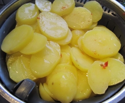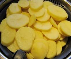 - Die Kartoffeln ca. 17 Min./Varoma/Stufe 2 garen. Zwischendurch eine Garprobe machen, die Kartoffelscheiben sollten nicht zu weich sein. Die Kartoffeln beiseite stellen und die Garflüssigkeit auffangen. Der Mixtopf muss nicht gespült werden.