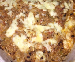 Den Kohl aus dem Varoma in die Auflaufform geben ( Es kann noch etwas Muskatnus drüber gestreut werden ) .Jetzt die fertige Hacksoße über den Kohl in der Auflaufform verteilen und gut vermischen , den Käse drüber streuen .
