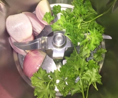 Die Zwiebel,Knoblauchzehe und Petersilie in den