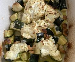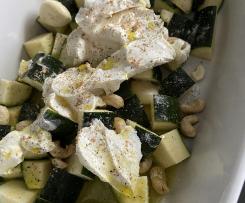 - Zucchini, Knoblauch, Cashewkerne, Frischkäse, Olivenöl,Salz, Pfeffer und Muskat in eine Auflaufform geben und 20 Minuten bei 220*C backen.