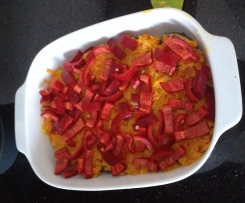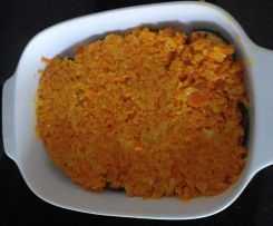 "Mixtopf geschlossen" geben 5 sek./st.4 zerkleinern und auf dem Gemüse verteilen. (ich hatte die heute ohne Thermie geschiebelt gehabt)Darauf die restlichen Zuccinis verteilen, leicht salzen.