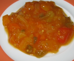 "Linkslauf" / Stufe 3 unterrühren.Den Fertigen Relish in heiß ausgespülte Schraubgläser Randvoll füllen, Gläser verschließen und bis zum erkalten auf den Kopfstellen.