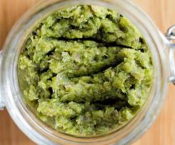 Das Öl in einer Pfanne erhitzen und darin den pürierten Chili-Mix anbraten, bis es aromatisch duftet. Dann die Hitze etwas runter drehen und die Austernsauce und das Salz hinzufügen. So lange bei mittlerer Hitze einkochen lassen, bis die gewünschte, pastenartige Konsistenz erreicht ist.
