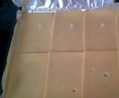 Alufolie auf ein Backblech geben und mit Öl bestreichen. Dann die Käsescheiben drauf legen, so dass sie leicht übrlappen. Nun bei 100 Grad in den Ofen. Bitte dabei bleiben und rausnehmen, sobal der Käse anfängt zu schmelzen. Er darf keine Blasen schlagen.