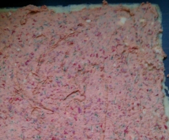 Nun die Masse auf den Käse geben und fest aufrollen. Ich wickel es dann gleich in die Alufolie vom Blech und dann kommt es in den Kühlschrank.