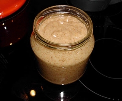 Mir ist Margarine zu ungesund, daher ersetze ich sie durch Mandelöl, das ich vorsichtig zugieße bis das Mus schön cremig ist