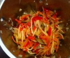 Nach dem Durchziehen der Sauce läßt die Schärfe der Gewürze aber auch gern noch ein wenig nach.
