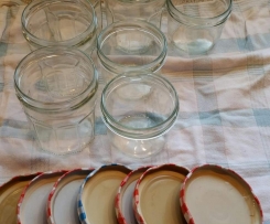 Währenddessen gespülte Gläser und Deckel in einen Topf mit Wasser geben und kurz aufkochen. So mache ich es seit vielen Jahren und mir ist noch nie Konfitüre schlecht geworden. Zange ebenfalls kurz in das heiße Wasser geben und damit dann die Gläser aus dem Topf nehmen und auf ein sauberes Handtuch stellen.
