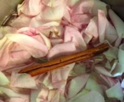 Die Blütenblätter der 8-10 Rosenblüten abzupfen und das Weiße am Blütenblattansatz abschneiden (schmeckt sonst bitter!). Zusammen mit: Wasser, Zimtstange und Koriander in einem kleinen Topf zum Kochen bringen (max. 3-4 min.). Dann beiseite stellen und abkühlen und 30 min. ziehen lassen. Danach durch ein Sieb abgießen und den Sud auffangen (ca. 200 g) und am Schluss das Rosenwasser hinzufügen.