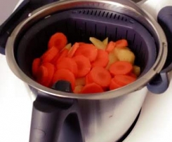 Kartoffeln und Möhren in Stücke / Scheiben schneiden, und in den Gareinsatz geben.