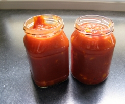 Die Sauce schmeckt als Schnitzelsauce oder zu Gegrilltem. Sie reicht für 8-10 Personen. Reste friere ichz.B im Tomatenpaprikaglas nach Abkühlung ein