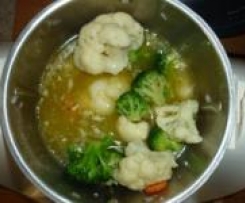 Wasser, Gemüsebrühepaste, Blumenkohl u. Brokkoli in den Mixtopf, 20 Min./100°C/St. 1