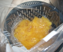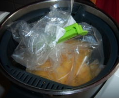 Die Eier gut mit dem Salz verrühren und in den Gefrierbeutel füllen und zuknoten und Wasser ,und Gareinsatz in