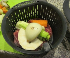 Zwiebel halbieren und mit denSchneideflächen in eine Pfanne ohne Öl geben und anbräunen. Danach die Zutaten für die Suppe in den TM geben, Deckel drauf und 7 Min. 100° Stufe 1 kochen.