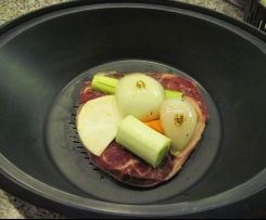 Eine Beinscheibe mit einem Teil der Gemüsebeilage ohne Kürbis in den Gareinsatz, eine Beinscheibe mit einem Teil der Gemüsebeilage ohne Kürbis in den Varoma geben. Gareinsatz einsetzen, Deckel drauf, Varoma aufsetzen und 50 Min. Varoma Stufe 1 garen. Beinscheiben warmstellen. Kürbis und fertige Leberknödel (ich hatte sie vor einigen Wochen gekocht und die übrigen Leberknödel eingefroren) in den Gareinsatz geben, Deckel schließen und weitere 20 Min. Varoma Stufe 1 garen. Nach Geschmack noch nachwürzen mit frisch gemahlenem Pfeffer und evtl. ein wenig Cayennepfeffer.