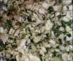 "Mixtopf geschlossen" wiegen und in 3 sec / Stufe 5 zerkleinern - mit zu den Zucchini in die Schüssel füllen.