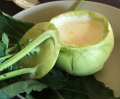 2. Nun jeden einzelnen Kohlrabi gut aushölen = alles in eine sep. Schüssel. Die Holkörper ebenfalls gut aufbewahren, diese werden als "Suppenschüssel" verwendet.