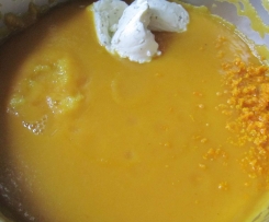 Die Suppe 30 Sek. / St. 9 pürieren. Den Frischkäse, die Orangenschale und den -saft mitsamt dem in der Presse hängenden Fruchtfleisch hinzufügen (bei mir waren es 190 g Saft/Fruchtfleisch, was ich persönlich im Nachhinein schon etwas zu viel fand) .....