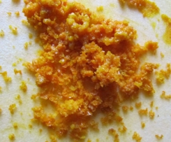 In der Zwischenzeit die Schale von einer Orange dünn abreiben und auspressen. Evtl. eine zweite Orange ebenfalls auspressen.