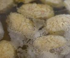 In einem Topf gut 2 Liter Gemüsebrühe zum Kochen bringen und mit einem Suppenlöffel kleine Klößchen formen. Dabei ist es empfehlenswert die zweite Hand zum Formen leicht feucht zu halten.