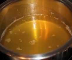 Über einem großen Topf ein Sieb einhängen und ein Küchentuch (einfaches Geschirrtuch) legen. Nach und nach die Suppe in das Tuch einfüllen und durchtropfen lassen. NICHT AUSPRESSEN !! Es sollen so wenig wie möglich Trübstoffe in den Topf gelangen. Der Vorgang wird mehrere Stunden in Anspruch nehmen.