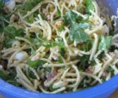 Aufgrund der Kommentare habe ich den Salat auch nur mit 500g Spaghetti gemacht, das passte gut mit der Saucenmenge. Rucola hatte ich vergessen zu kaufen, aber der wurde auch nicht vermisst.
