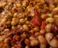 Wenn nach dem Backen noch zuviel Flüssigkeit vorhanden ist, ruhig etwas abgießen, die Bohnen müssen schön schlotzig sein.