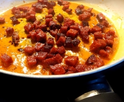 In der Zwischenzeit die Chorizo-Würfel in einer großen, ofenfesten Pfanne kurz auslassen, Fett abgießen.