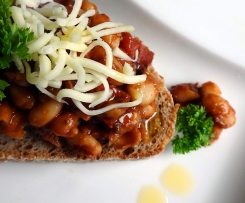 Zum Servieren das Brot toasten und die gebackenen Bohnen darauf verteilen, mit etwas Cheddar bestreuen, mit Rosmarin-Chili-Öl beträufeln und: