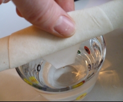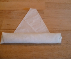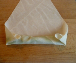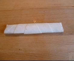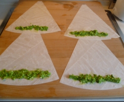 Dann die Käse-Petersilie-Füllung auf die Teigblätter geben und wie auf den Bildern gezeigt einrollen. Die Enden in Wasser eintauchen und die Rollen verschließen.Die fertigen Rollen dann frittieren oder in einer Pfanne mit Öl bedeckt schön goldgelb garen lassen (ca. 5 Minuten gesamt, erst Stufe 3, dann auf 2).
