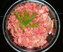 Anstelle der TK-Johannisbeeren können auch frische Beeren verwendet werden; dann aber nicht mit der Zwiebel zerkleinern, sondern erst im folgenden Schritt mit zufügen.