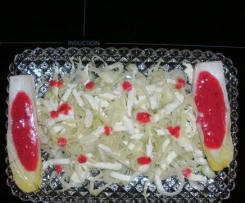 Fechel und Mozzarella mischen und auf einer Platte anrichten, Fenchelgrün darüber streuen und mit einigen "roten" Salatklecksen verzieren. Soße separat dazu reichen, z.B. in Chichoree-Schiffchen.