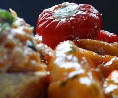Die gefüllten Paprika dicht an dicht über Kopf in eine flache Schüssel legen, etwas andrücken (damit sie sich etwas verschließen) und mit Olivenöl bedecken - für mindestens 4-6 Stunden im Kühlschrank ziehen lassen, am Besten über Nacht.