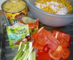 Während dessen den Fleischsalat und Mais in eine große Schüssel geben.