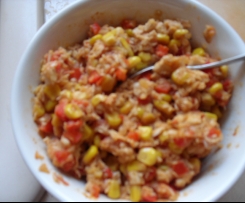 Die Paprika und das Fleisch ebenfalls würfeln (jeweils in Größe der Maiskörner).