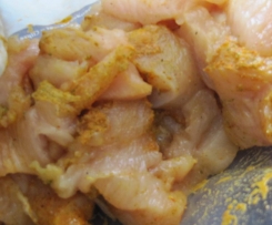Paprika-, Currypulver, Salz, Pfeffer und Mehl in eine Gefrierbeutel geben ....
