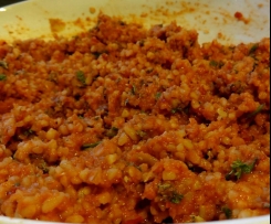 Nun zu den Schalotten die restl. Chilistreifen, Tomaten- und Paprikamark, Piment, Pfeffer, Kräuter und Linsen-Bulgur-Masse geben und gut vermischen, mit Salz abschmecken.