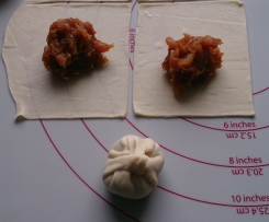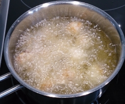 Die Teigenden zu einem Säckchen schließen, diese fest zusammendrücken. - Die Säckchen in Öl fritieren ca. 5 min und mit Asiatischer Sauce servieren.