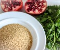"Mixtopf geschlossen" geben, 5 Sek. Stufe 5, mit dem Spatel runterschieben.Das Öl dazugeben und 3 Min. Varoma, Stufe 1, anschließend das Wasser zugeben und weitere 3 Minuten Varoma Stufe 1 köcheln lassen.Während dessen Minze und Koriander klein schneiden, Granatapfelkerne aus der Schale lösen. Zur Seite stellen.